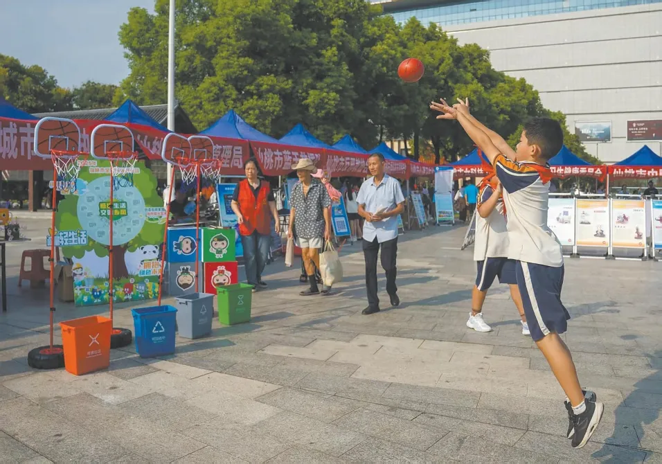 互动区成了“欢乐课堂”,磁吸式分类板模拟菜市场、学校等场景,小学生指着水果铺里的螺丝钉喊:“这是可回收物!”投篮大挑战、大转盘等游戏,让分类知识在欢笑中植入脑海。